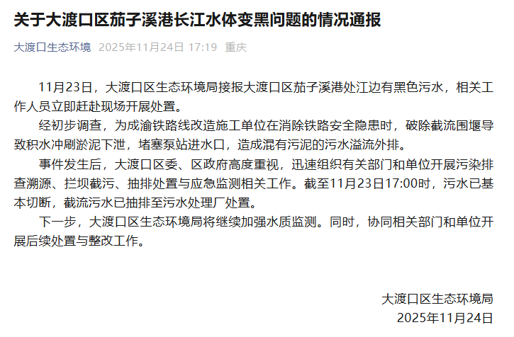 事件发生后,大渡口区委、区政府高度重视,迅速组织有关部门和单位开展污染排查溯源、拦坝截污、抽排处置与应急监测相关工作。截至11月23日17:00时,污水已基本切断,截流污水已抽排至污水处理厂处置。